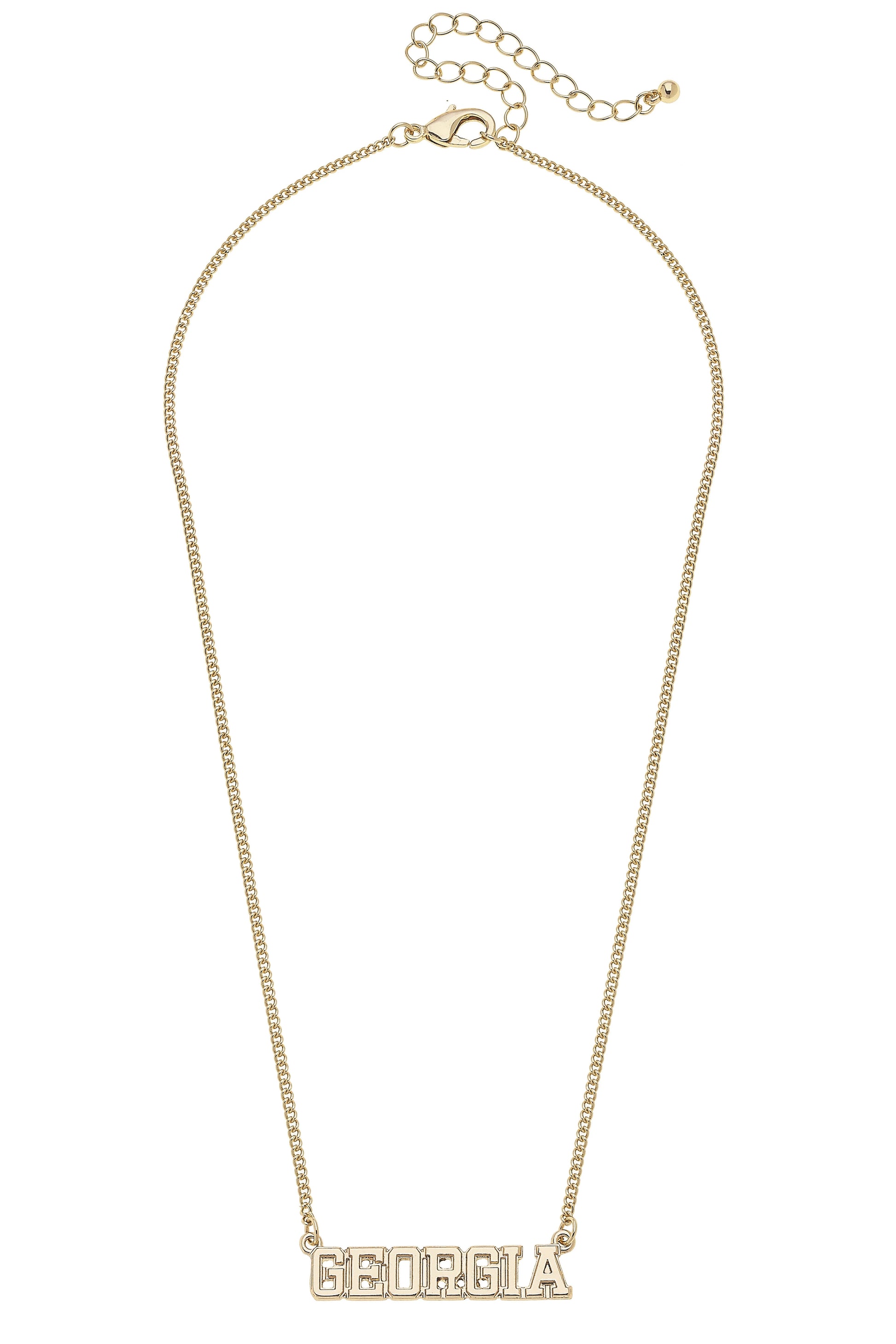 Keep your team spirit close to your heart with this Varsity Outline Necklace. Featuring a sleek, shiny gold-plated pendant in a classic varsity font, this necklace is the perfect mix of sporty and chic.