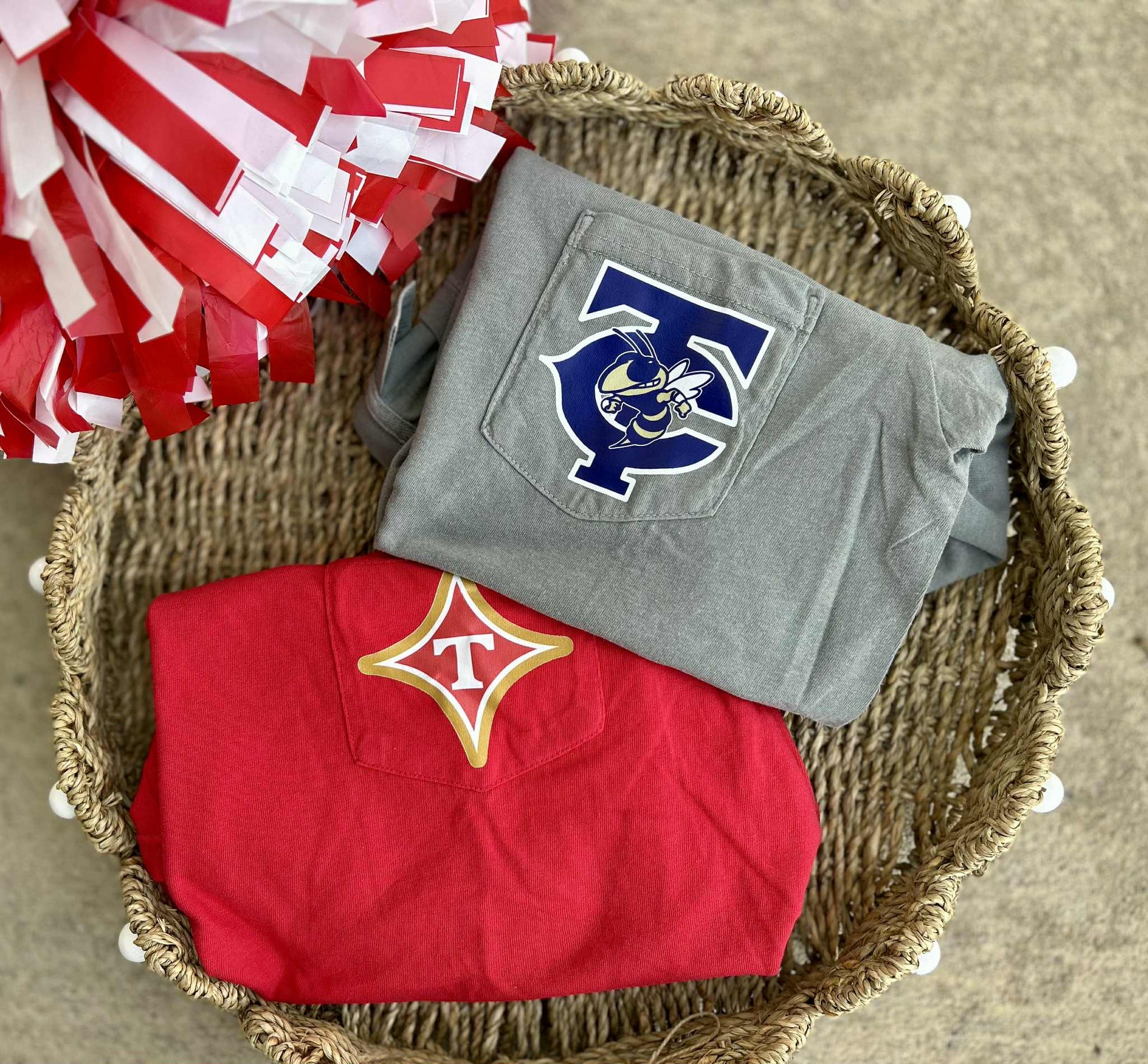 Pocket tee comfort color brand. Red has a bulldog diamond T on the pocket, and the gray has a TC on the pocket.