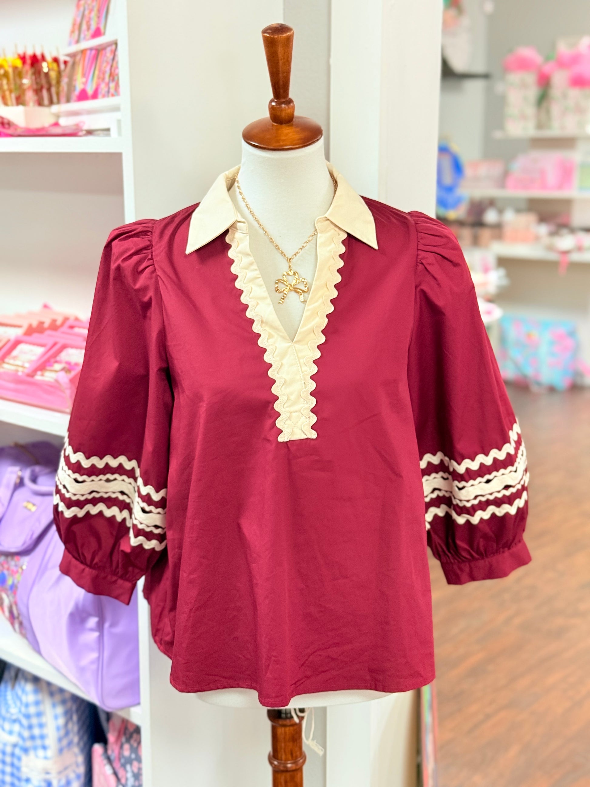 Solid 3/4 puff sleeve top featuring contrast collar and scallop trim V-neck with rickrack trim on sleeve panels. Unlined. Woven. Non-sheer. Lightweight.
