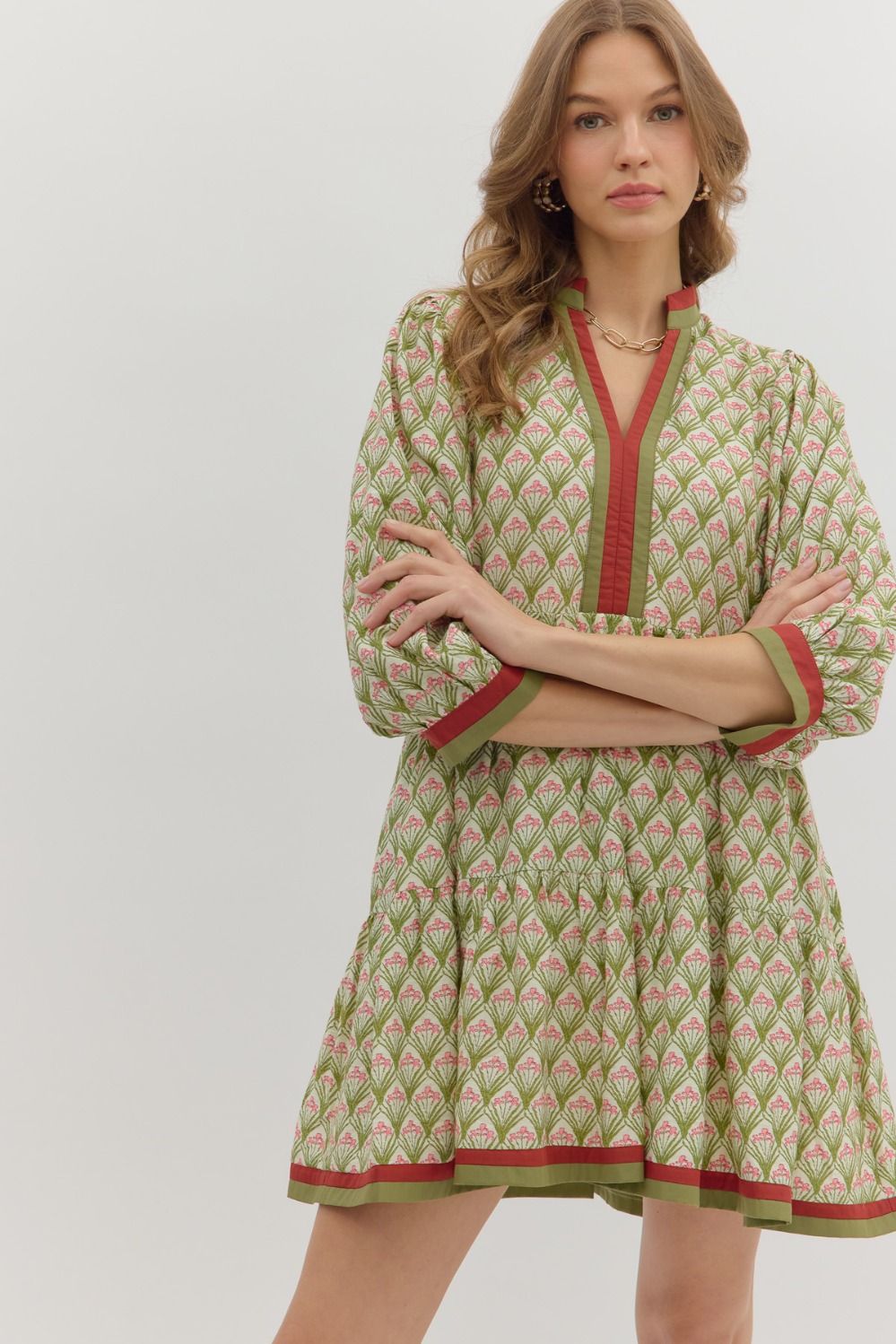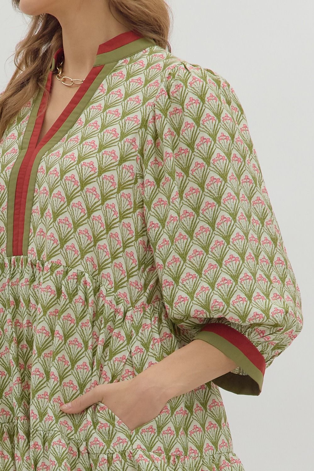 Floral pattern ¾ sleeve tiered mini dress featuring multicolor V-neck collar with accent band and hem detail. Side pockets. Lined. Woven. Non-sheer. Lightweight.