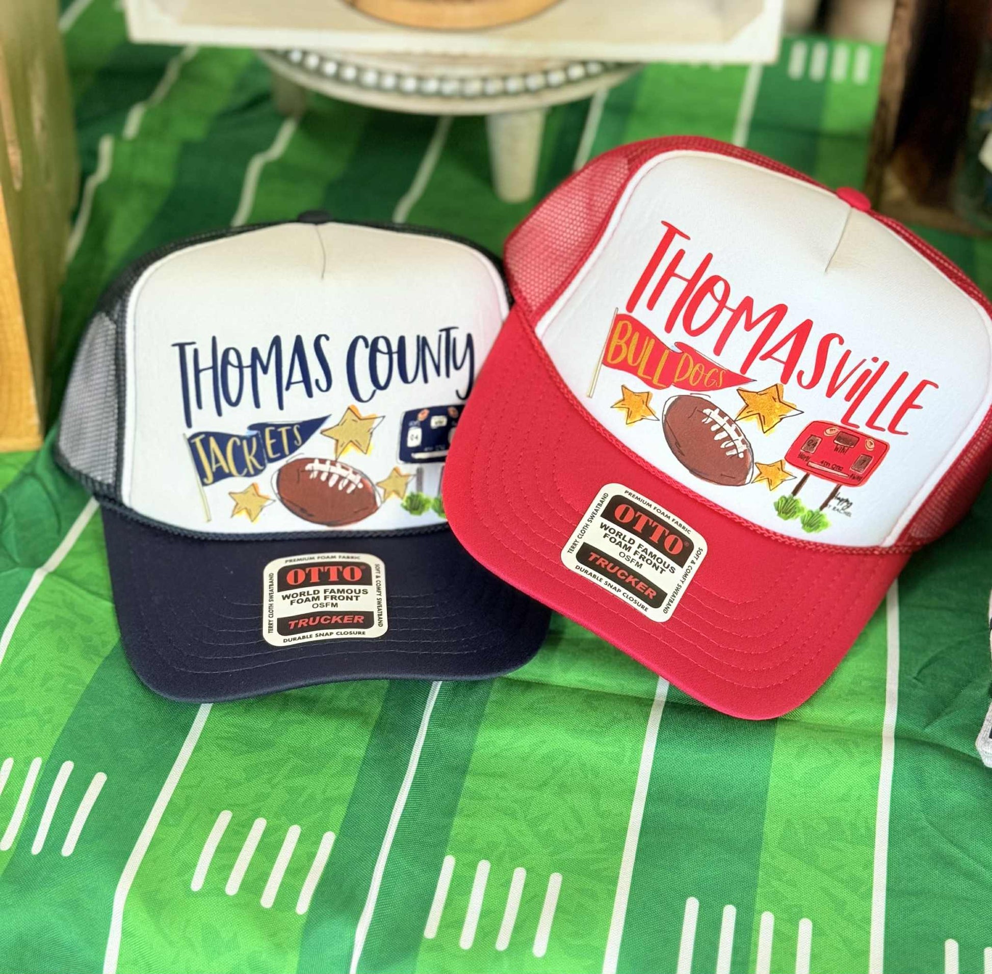 Friday nights just got better with our custom-made trucker hats!! Available in navy for Thomas County and red for Thomasville... this addition to your gameday fits is a must!