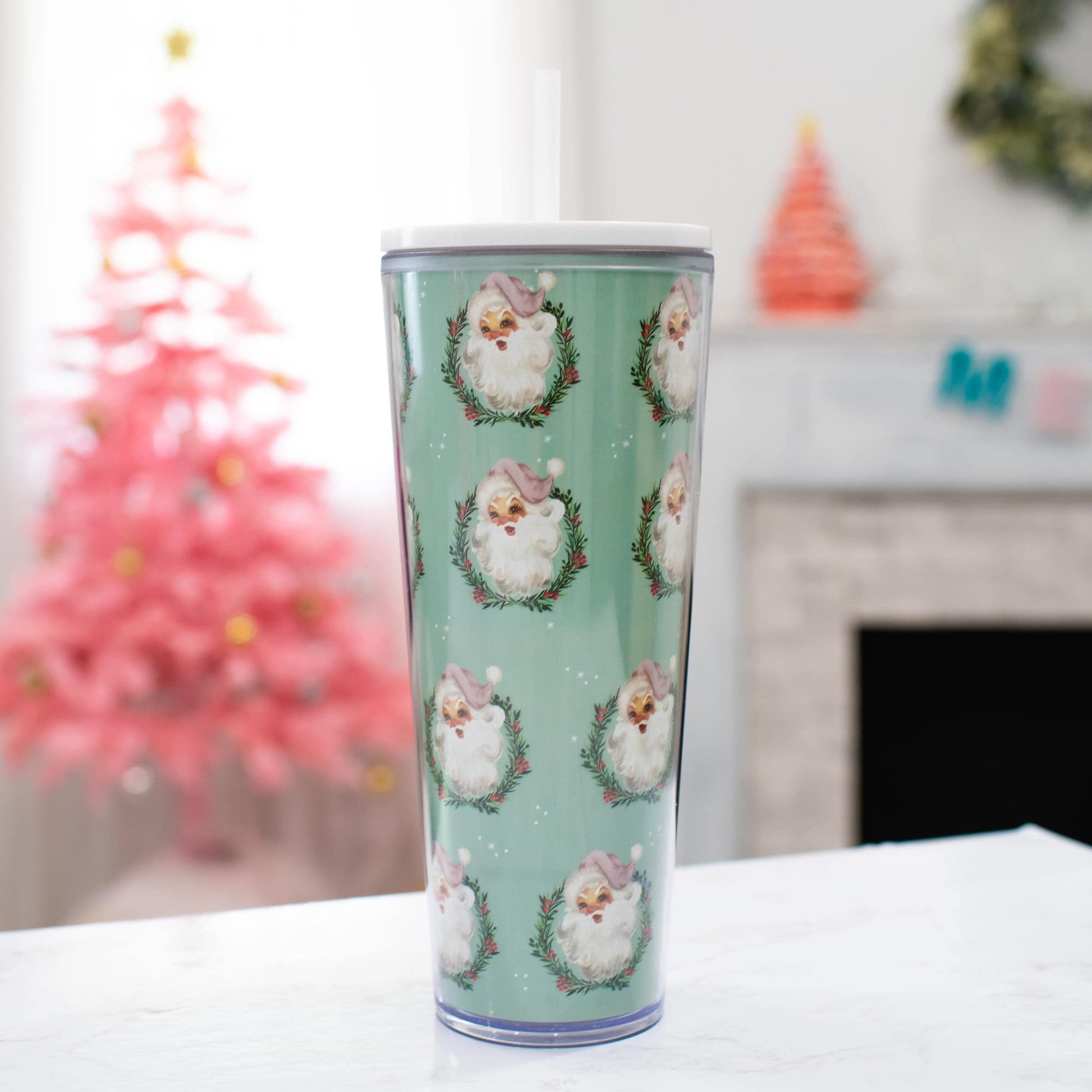 - Charming travel tumbler will be an instant conversation starter; Features festive pattern Santa faces in holly wreaths