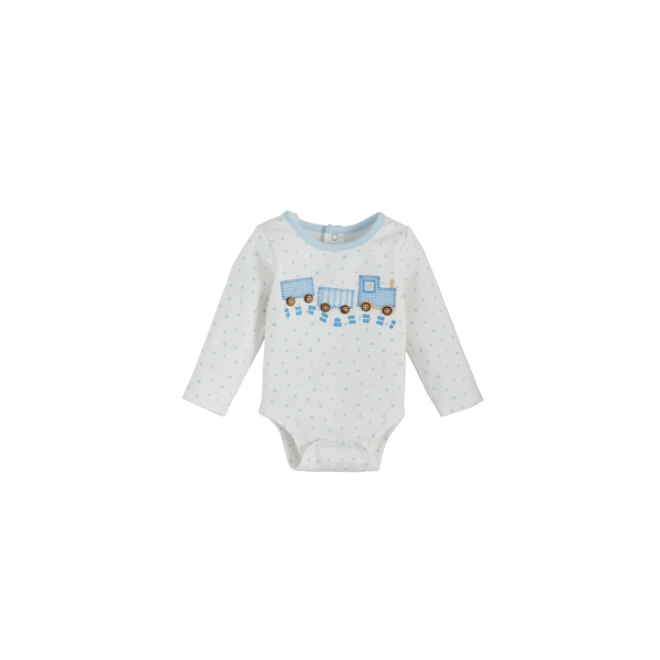 This charming blue appliqué baby bodysuit is designed with delicate pointelle detailing, adding a touch of elegance to your little one's wardrobe. The long sleeves provide extra warmth and comfort, making it perfect for cooler days. Convenient inner leg snaps ensure easy diaper changes, allowing for quick and hassle-free dressing. Crafted from 100% cotton, this bodysuit is soft and gentle against your baby's sensitive skin, ensuring all-day comfort. Available in size 0-3 months, it offers a snug and cozy fit for your newborn.
