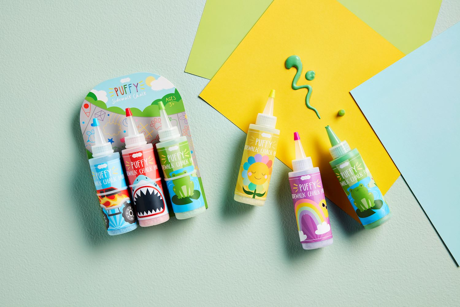 Set of three chalk paints come in squeeze bottles for sidewalk drawing. Chalk dries dimensionally for puffy effect.