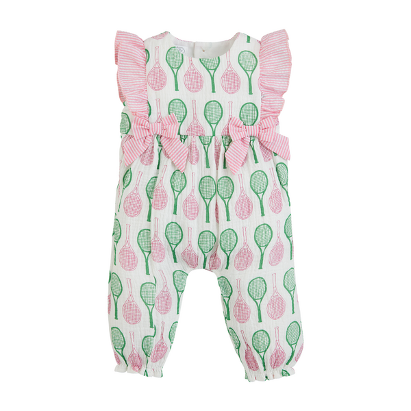 The Tennis Print Baby Longall is an adorable and cozy outfit for your little one. Crafted from soft and breathable cotton gauze, this longall showcases charming seersucker flutter sleeves and tacked bows. It also features inner leg snaps for effortless diaper changes. To maintain its quality, simply machine wash it cold with similar colors after turning it inside out. Avoid using bleach and tumble dry it on low heat. If needed, you can cool iron it. The body of the longall is composed of 100% cotton, while the trim is a blend of 81% polyester and 19% cotton.